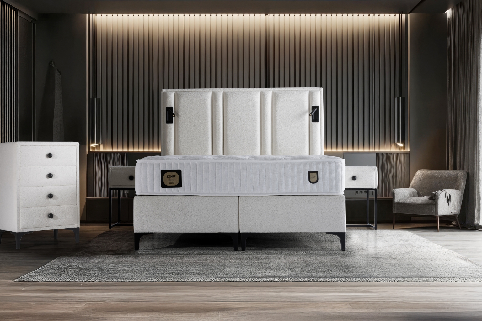 Deze luxe boxspring Zenit combineert modern design met hoogwaardig slaapcomfort. Het strak vormgegev..